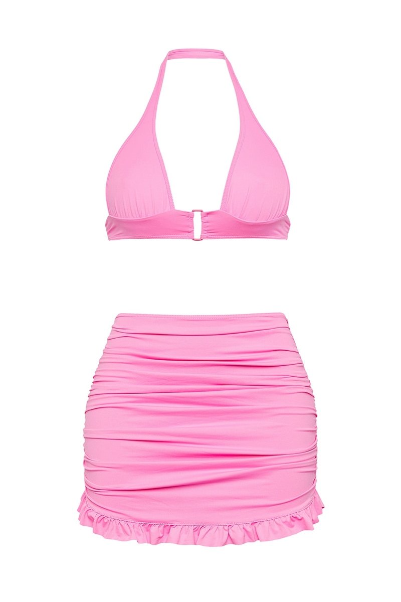 The Shelley Set is made from soft, premium quality fabric. The pattern is fitted and has a tope and a skirt. The fabric is elastic. The top has a halter neck. The skirt features can be rouched to adjust the length. Complete the look with the Bunny bikini.